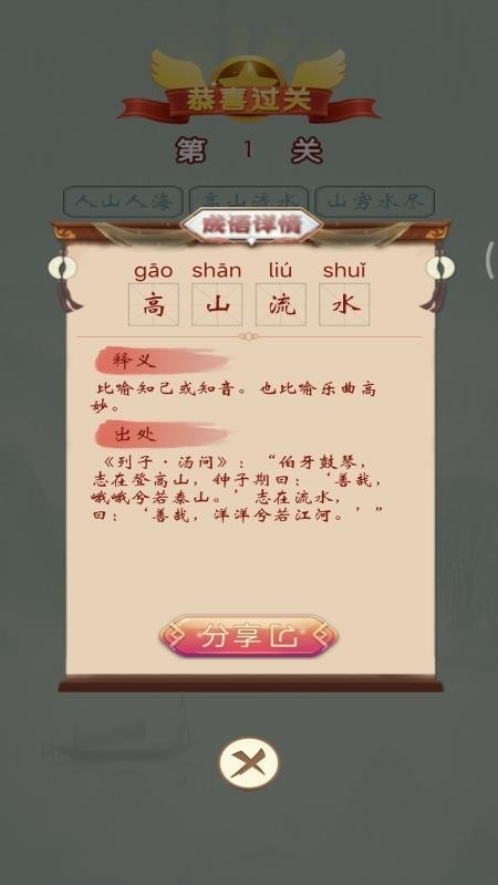答对题目会弹出成语详情供用户查看学习,了解成语的释义和出处详情。