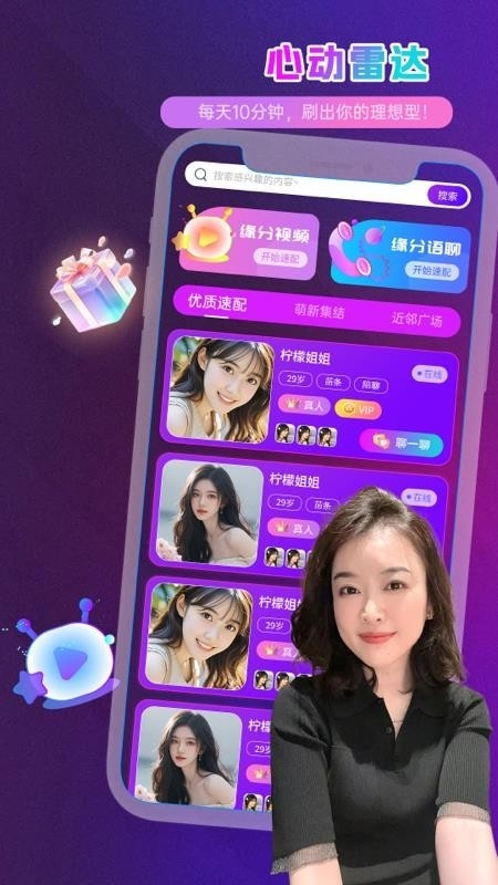 2、智能速配功能:提供一键视频/语音速配模式,结合地理位置与用户偏好快速匹配在线异性,同时支持自主筛选同城附近用户,提升交友效率。