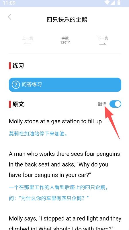 3、在内容详情页,可使用问答练习功能,也能切换原文与翻译的显示状态。