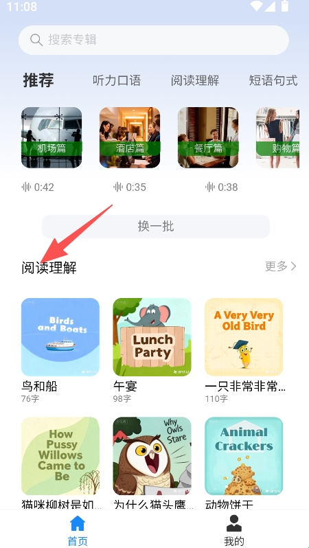 1、打开软件,进入首页选择阅读理解板块,查看对应分类下的学习内容。