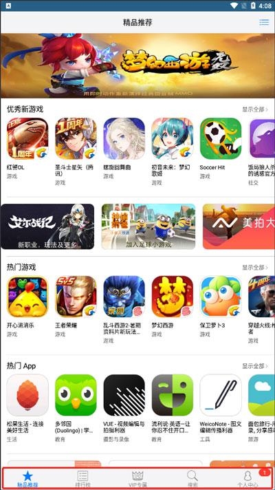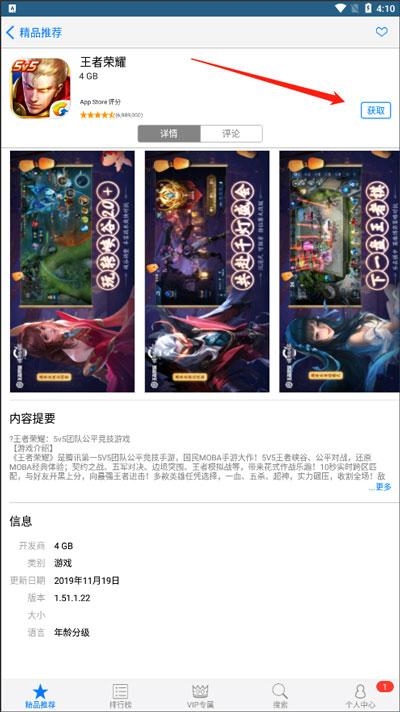 2、登入之后会看到,精品推荐、排行榜、VIP专属、搜索、个人中心五大板块:找到合适的游戏找到点进去: