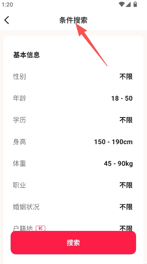 2、进入条件搜索板块,设置性别年龄等基本信息筛选条件。