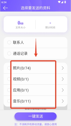2、选择需要传输的数据类型,比如照片或通讯录,勾选后点击开始传输。
