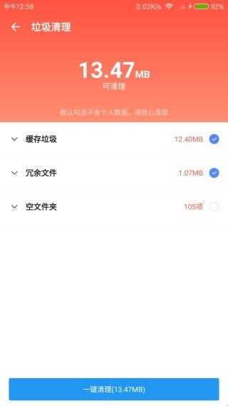 2、点击中间的"查看垃圾详情"就能看到扫描出来的垃圾文件啦,点击"一键清理"能快速释放手机内存与空间