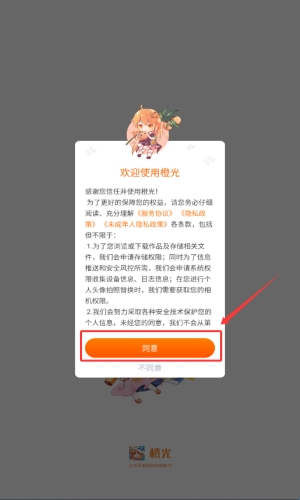 1、阅读用户协议后,点击红框标注的橙色同意按钮继续。