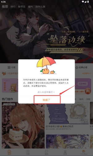 3、阅读青少年模式说明后,点击红框标注的橙色知道了按钮。