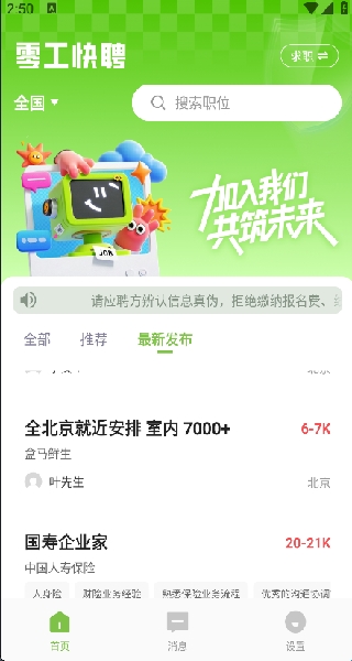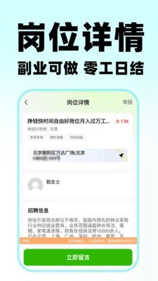 1、海量日结岗位,严格审核真实可靠:平台专注于提供以日结薪资为主的零工岗位,每日持续更新上千个工作岗位。所有入驻企业均经过严格资质审核与岗位双重审核机制,确保每一个岗位信息真实、薪资透明,从源头上保障您的权益。