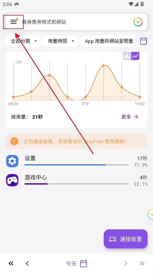 1、进入stayfree软件的主界面当中,选择左上角的三条杠;