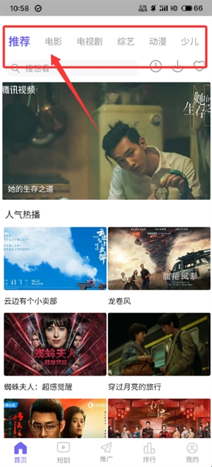 1、首页导航栏提供推荐、电影等分类标签,可切换浏览不同内容。