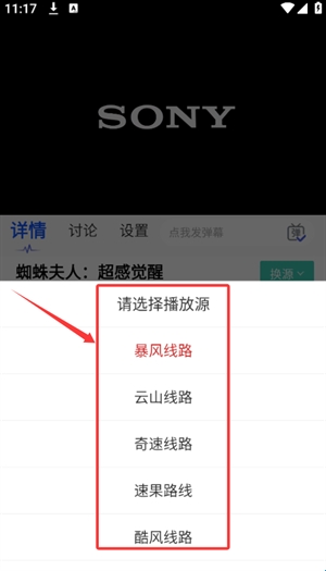 4、切换时将显示暴风、云山等多个来源,选择后即可正常播放。