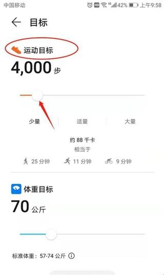 4、在目标页面,拖动【运动目标】的滑块,设置运动目标步数。