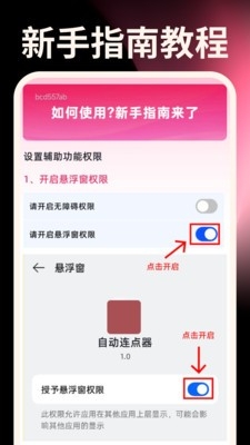 4、浮窗操作功能:通过浮窗图标实现功能控制,可随意拖动浮窗位置,点击浮窗即可进行点击设置、启动或停止连点等操作。