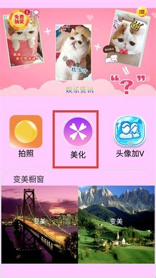 1、进入软件首页,找到【美化】功能按钮并点击,可进入图片美化的前期选择流程,准备对目标图片进行编辑操作。