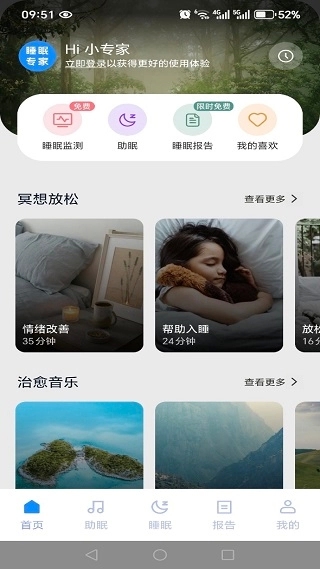 1、在首页,我们可以看到睡眠监测、助眠、睡眠报告等众多功能,能轻松进入。