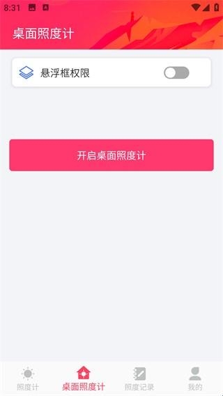 3、在首页下方栏点击桌面照度计,就可以开启桌面光照检测,还可以设置悬浮权限。