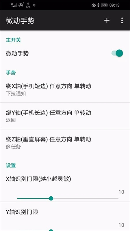 1、支持沿三个轴的旋转手机动作,可自定义动作。缺省绕X轴(手机短边)旋转为下拉通知,绕Y轴(手机长边)旋转为返回,绕Z轴(垂直于手机屏的轴)旋转为多任务。