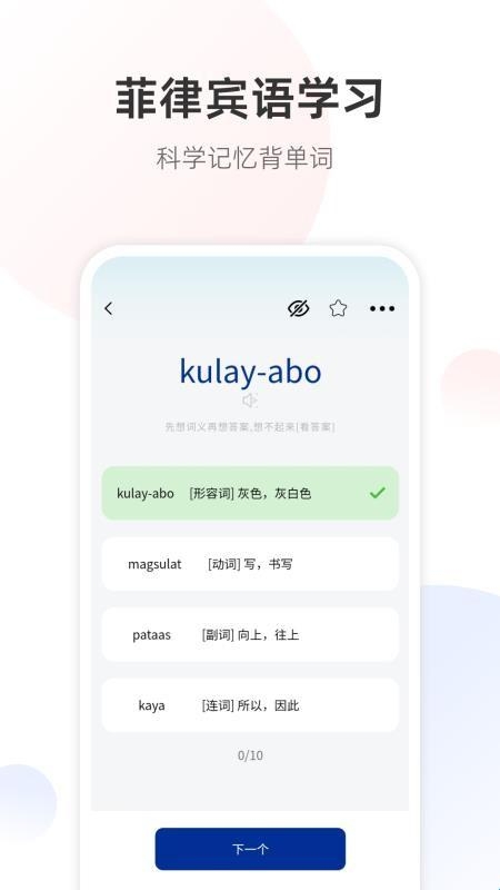 菲律宾语翻译通APP为用户提供了诸多语言学习工具,多种翻译模式,并且操作都十分简单,每个用户都能直接上手使用,帮助你翻译学习菲律宾语言更加便利,节省更多学习时间,轻轻松松就能掌握每一个单词和发音, 学习更高效;快来下载一起学习吧!