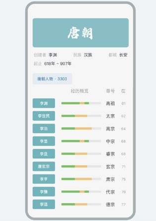 3、提供数据可视化和统计功能,分析历史数据。例如,你可以查看李世民家族的鲜卑族背景,了解他们的迁徙历程、社会地位以及与其他族群的关系。