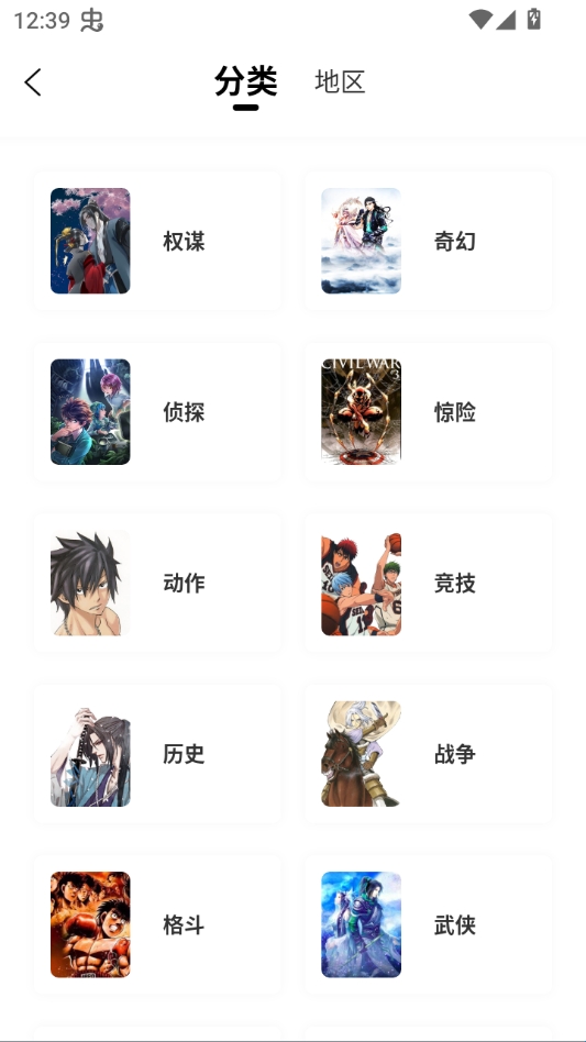 2、接下来我们可以从分类里选择权谋、奇幻、侦探、惊险、动作、竞技等多种类型的漫画资源。