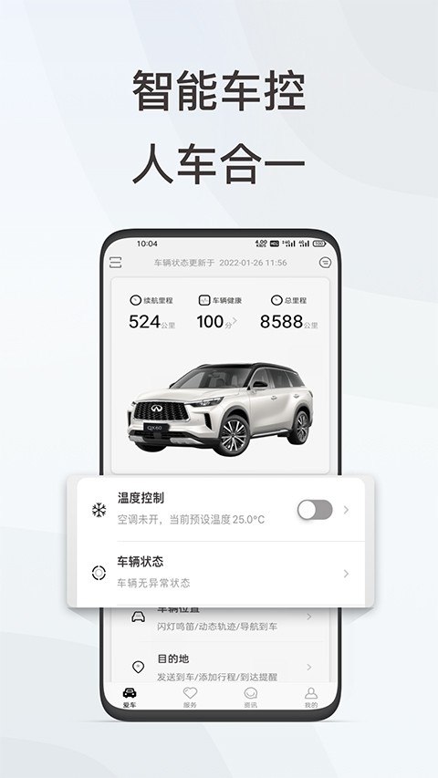 1、可以帮助用户添加车辆开启智能控制,主要服务于英菲尼迪汽车,实时了解车辆状态,包含了续航里程、车辆健康和总里程数据,还有多种汽车服务可以选择,需要的伙伴,即可使用哦
