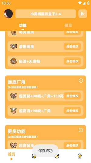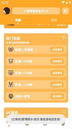 小雾博画质盒子是一款专门为喜欢打游戏的用户设计的游戏辅助软件,在此软件里面可以进行一键修改画质,同时还可以根据自己的需求自定义游戏的帧率,就算您的低配机,也可以享受到120帧加超高清的流畅体验,喜欢的朋友还在等什么呢,一起来下载吧!