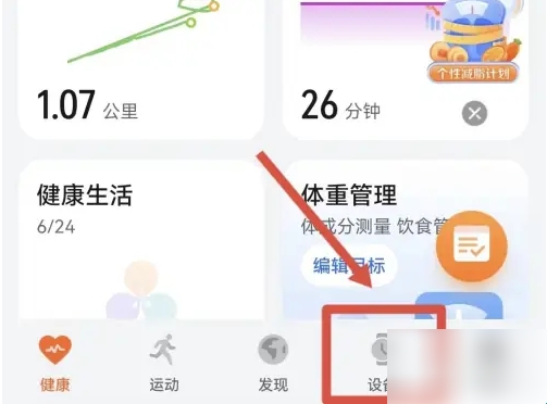 1、在荣耀手机的运动健康页面点击切换到设备选项。