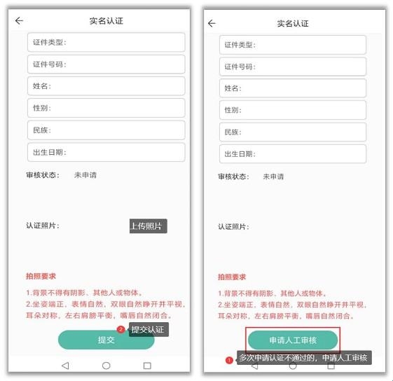 首次登录时 App 会自动进入实名认证界面,考生必须完成实名认证后才能进行报名等其他操作。进入界面后 App 会显示考生基本身份信息,考生需上传一张符合要求的照片进行公安实名认证。多次实名认证不通过的 App 会提示申请人工实名审核,申请后等待审核通过才能进入 App 主界面进行其他操作。