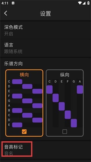 3、进入【设置】界面,能调整【深色模式】的开关状态,还可选择【乐谱方向】的横向或纵向显示样式。