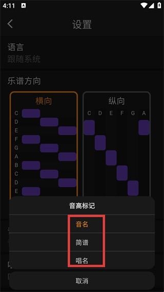 4、在【设置】的【音高标记】选项中,可选择【音名】【简谱】【唱名】任意一种方式,来设置音高的显示标记。