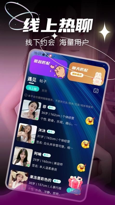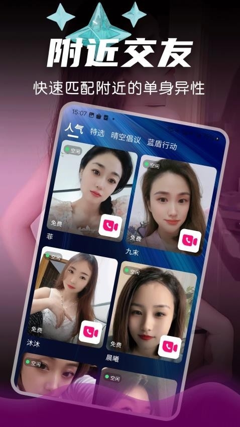 2、精准同城匹配推荐:依托地理位置定位技术,为用户推荐附近同城单身异性;匹配成功后可直接发起聊天或视频,缩短社交距离;