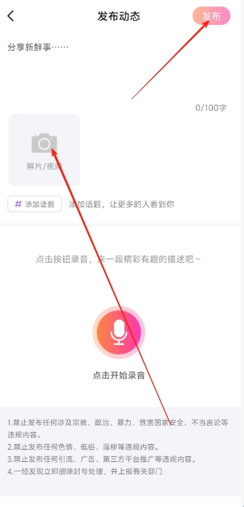 2、之后在发布动态页面中输入文案、图片等内容之后点击发布即可。