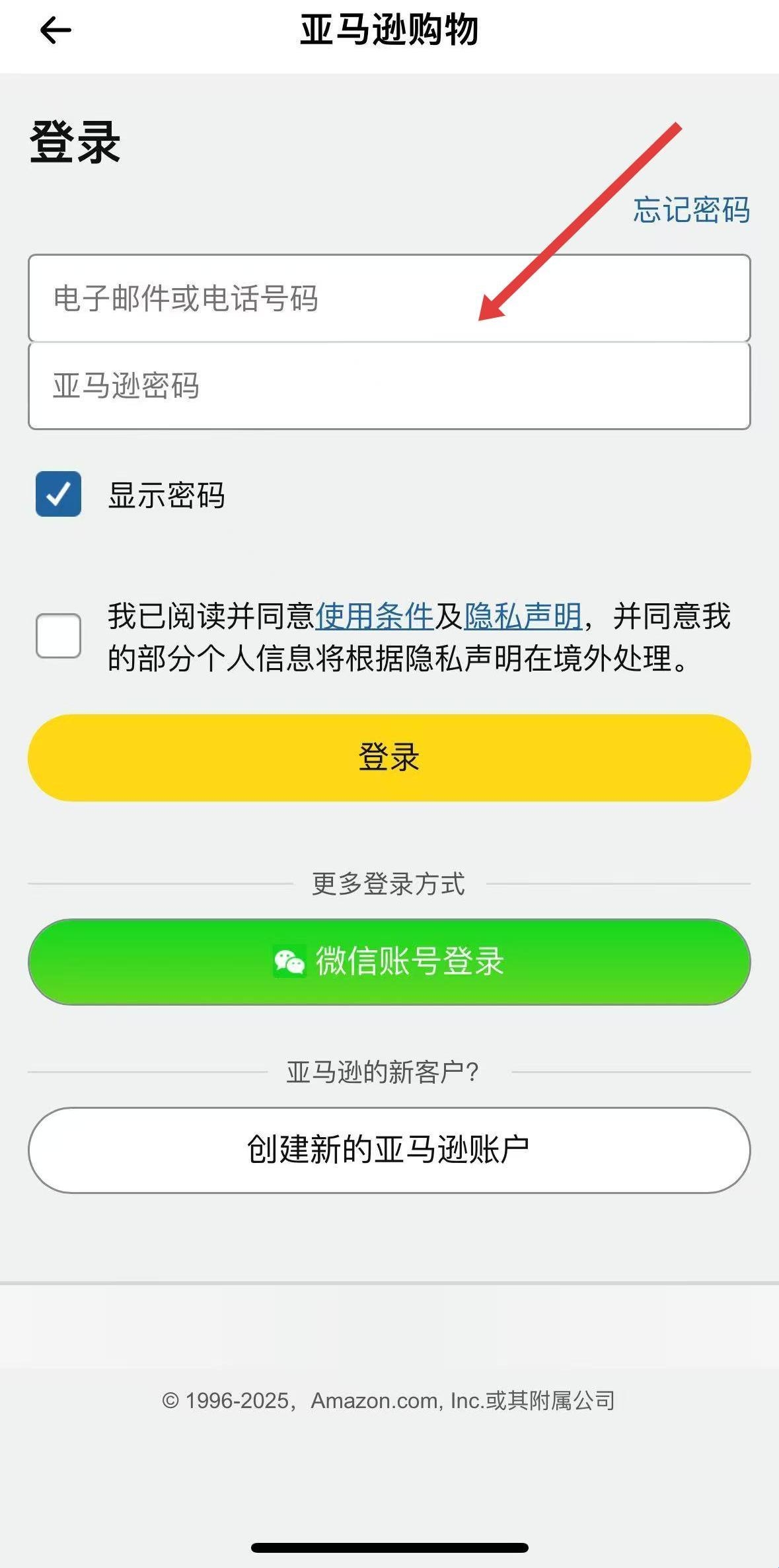 3、登录页面,用户可输入电子邮件或电话号码、亚马逊密码进行登录,还可选择微信账号登录。