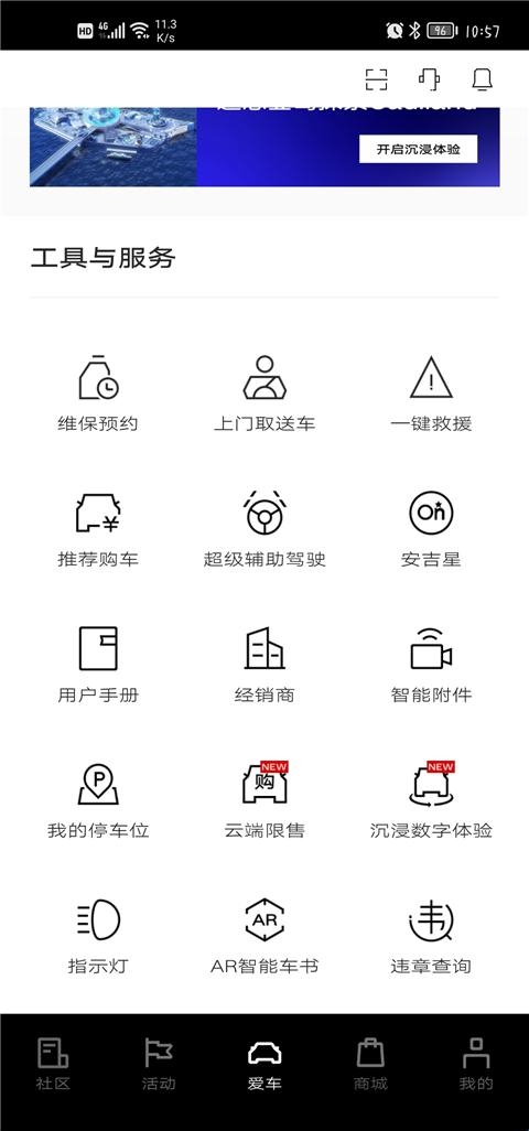 3、点击进入爱车,这里为用户提供了很多的工具和服务,用户可以进行维保预约、一键救援、上门取送车等操作。