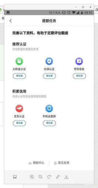 2、完成基本任务信息上传后我们可以看到自己的额度,此时点击下面的提额任务