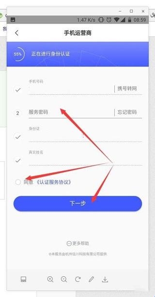 4、输入服务密码后,点击同意协议,然后点击下一步按钮