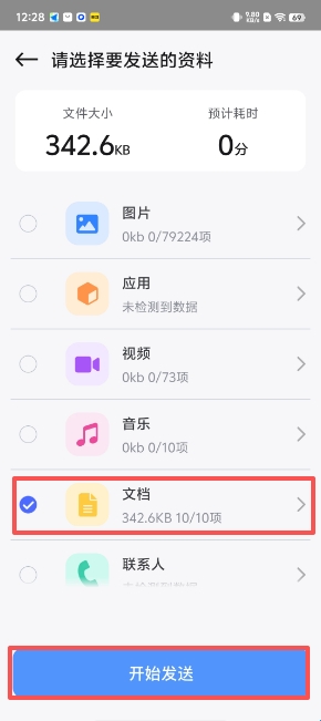 2、点击“旧机发送”,选择资料并找到页面上的“开始发送”。