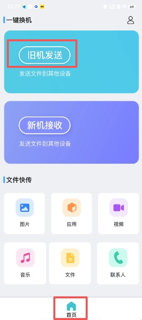 1、打开软件进入首页,找到页面上的“旧机发送”。