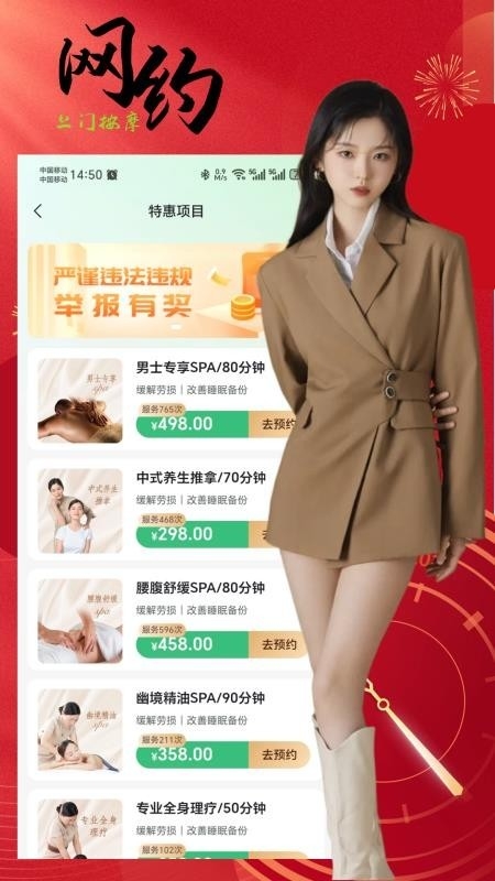 网约到家上门按摩是一款具有高质量按摩以及上门服务的软件,软件里面具有海量高颜值的上门按摩技师,而且大家可以根据自己的需求去选择您喜欢的按摩项目,软件里面的套餐全部都是明码标价的,没有任何欺骗消费者的情节,喜欢的朋友一起来下载吧!