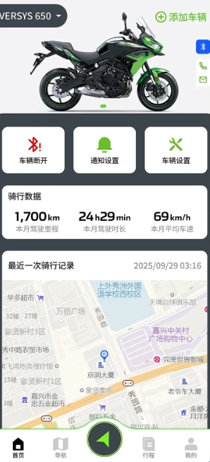3、连接状态管理:管理手机与川崎摩托车之间的蓝牙配对与连接,确保数据通信的稳定与安全,提供简洁的连接状态指示。