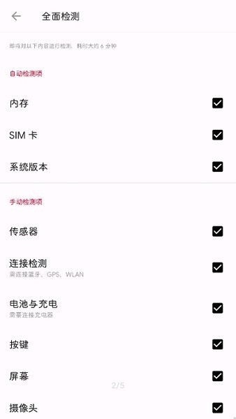 2、快速检测:启动后,用户可以选择自动检测或手动检测。自动检测将自动扫描手机各项硬件和系统信息;手动检测则允许用户根据需要选择特定项目进行检测。