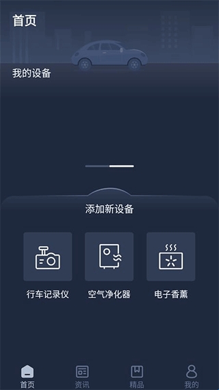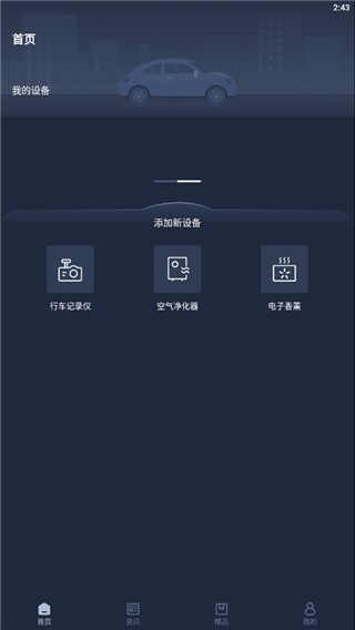 1、首先下载安装并打开软件,首页可以添加行车记录仪、空气净化器、电子香薰等设备;