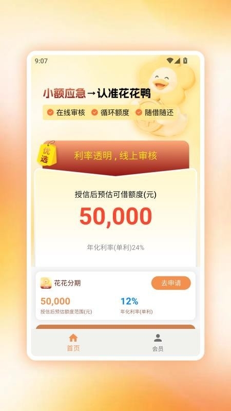 花花鸭app为用户们提供了一个申请便捷、息费超低的线上借款平台,费用透明、没有套路,用户可安心在平台上申请借款以及自由选择分期还款期限,非常方便;平台还会根据你的良好信用记录给出提额机会,让你可以享受更高额度。