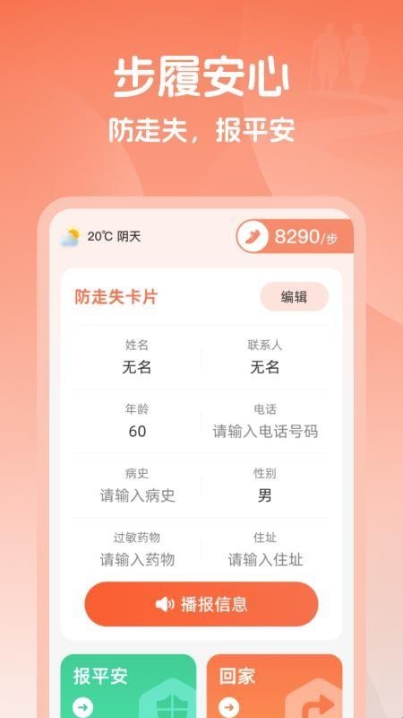 安心步迹是一款提供健康管理的多种功能软件,此软件当中可以设置走失卡片,可以有效的避免以及预防家里的老人以及小孩的走失,能够有效的保障家里老人与小孩的人身安全,同时还支持随时随地的记录每天的步数以及运动情况,大家可以在软件当中更好的查看到各项运动数据,喜欢的朋友一起来下载吧!