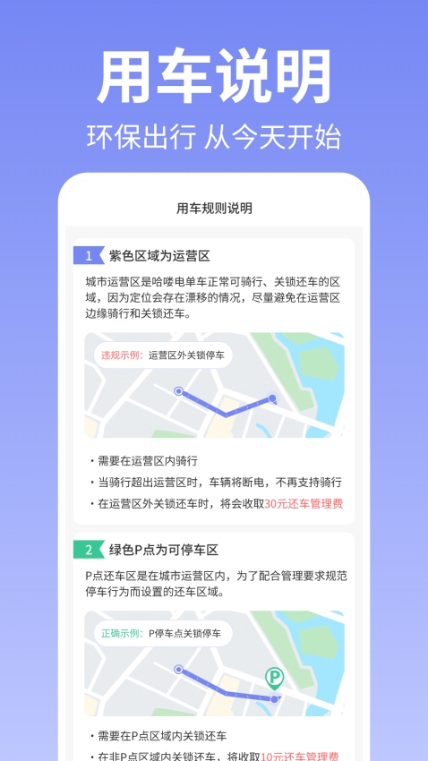 哈喽共享单车为用户提供详细的用车手册,帮助用户了解正确的运营区、停车区说明、违约骑行行为说明等。此外,用户还可以通过应用举报违规停车、损坏车辆等行为,共同维护良好的出行环境。