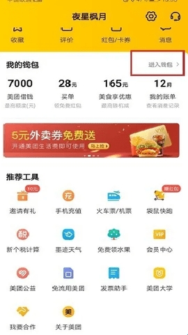 1、手机上打开美团,进去我的界面,点击我的钱包,如下图所示: