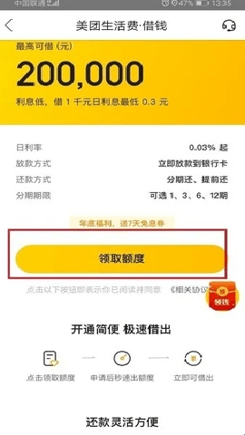3、美团生活费借钱界面之后,点击领取额度,如下图所示: