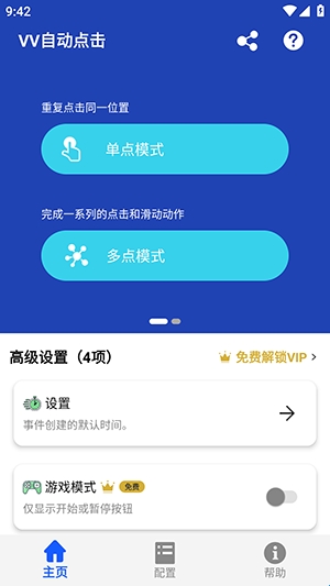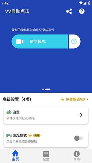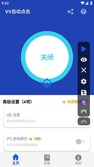 vv自动点击是一款手机自动点击器软件,软件当中的所有功能全程都是免费使用,大家可以随着自己的要求进行调整连点的次数以及速度,适用于平时的游戏点击、抢购商品、购买车票、等等场景,能够有效的帮助我们完成诸多任务需要,软件操作简单,内存占比不大,喜欢的朋友赶紧一起来下载吧!
