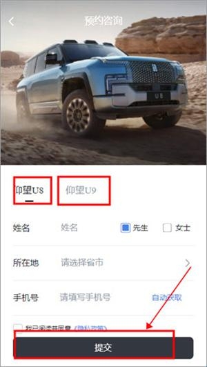2、选择需要咨询的车型,填好相应信息点击提交即可。