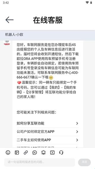 3、车联网服务在您办理提车后4S店提报您的个人及车辆信息后进行激活的,使用购车预留手机号注册登录车辆即会自动绑定,若使用购车预留手机号登录没有车辆信息可能为车联网功能未激活,可联系车联网服务中心400-666-6677确认一下哦。