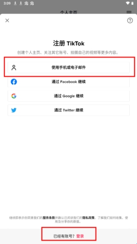 3、选择注册的方式,若已有账号点击下面的登录,输入账号密码即可。